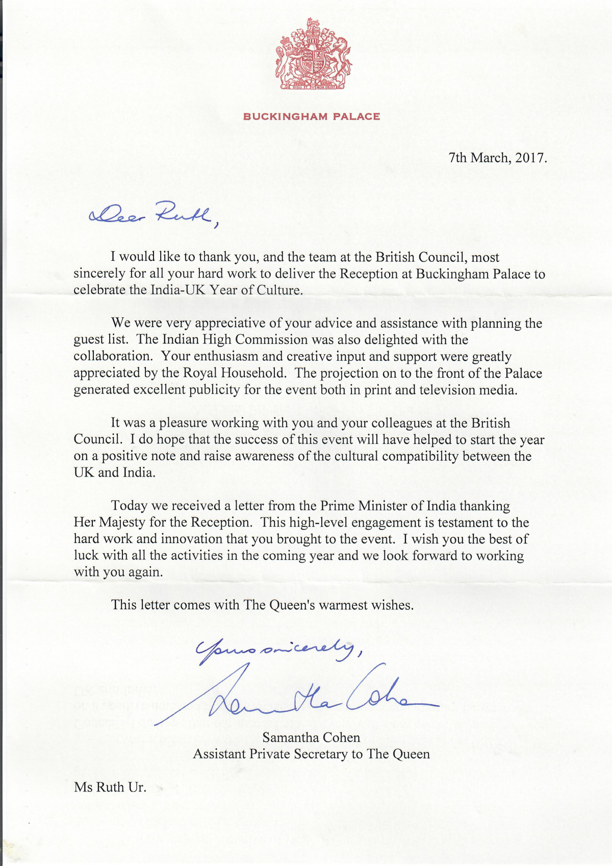 Ruth Ur was commissioned by Buckingham Palace to develop ideas for a reception, hosted by HM The Queen, to launch the UK India Year of Culture. Ruth came up with the idea to illuminate the facade with a work of art. She invited all-female, UK/India based design Studio Carrom to develop an image to celebrate the unique relationship between the two countries. This was the first-ever art projection covering the entire facade of the palace. It was a complex commission both because of the technical requirements, but also because of political sensitivities.