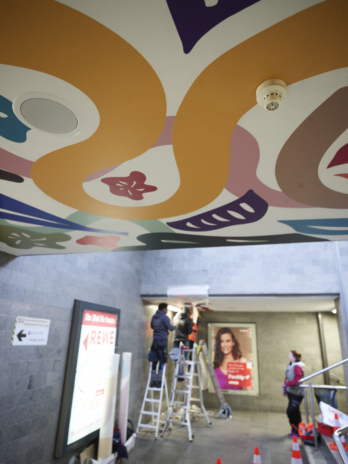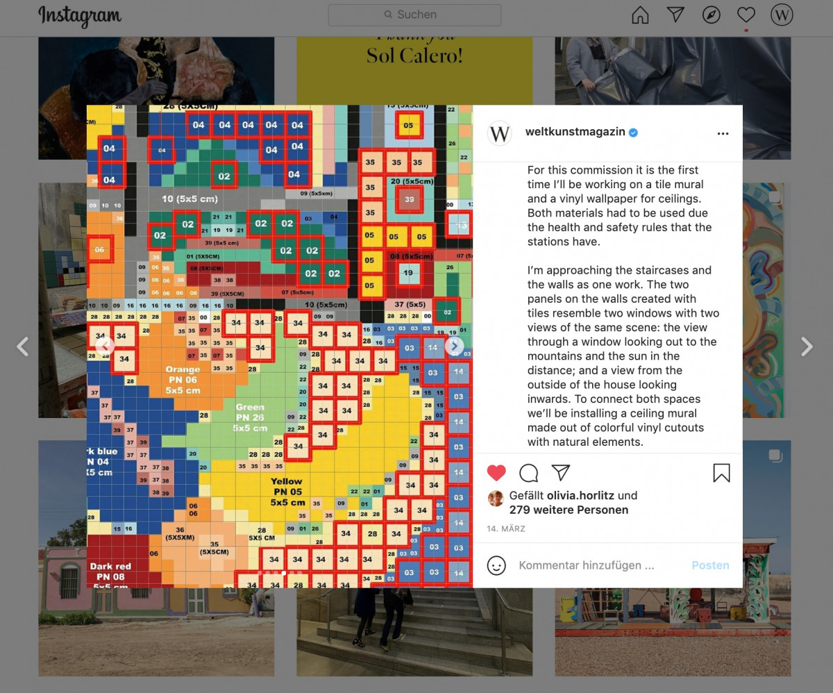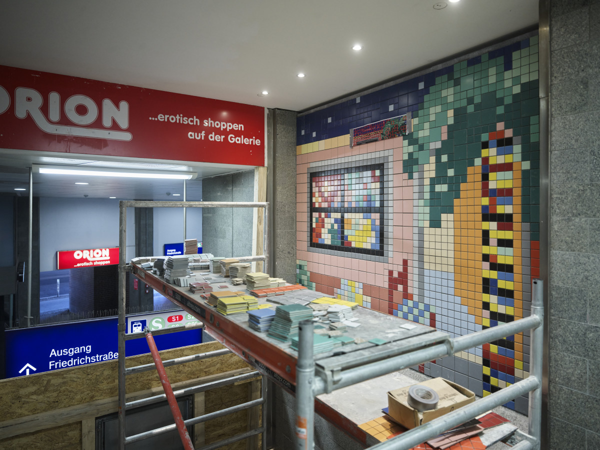 For the second edition of Exit Friedrichstraße, urKultur commissioned the Berlin-based artist Sol Calero. In this site specific art work, Calero uses tiles for the first time to recreate scenes from Los Roques, an archipelago north of Caracas, Venezuela where she grew up. The installation presents two views of the same scene: a window looking out to the mountains and the sun; and a view from the outside of the house looking inwards. Los Rocques bears the legacies of colonialism, and the picturesque houses – such as the one depicted here – present a combination of European, indigenous South American, and Afro-Caribbean influences. Calero uses the hybrid architecture and luscious setting to create a vision of paradise in the middle of Berlin; a tantalising vision created in the midst of the Covid pandemic. The fragmented image, with its vivid and alluring colours and hints of recognisable forms, is destined to remain a puzzle, challenging us to decipher what we see and desire. This edition of Exit Friedrichstraße was realised in cooperation with Villeroy & Boch and Weltkunst magazine.