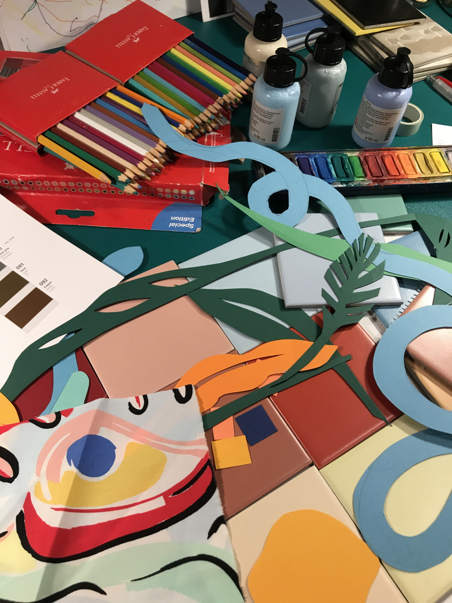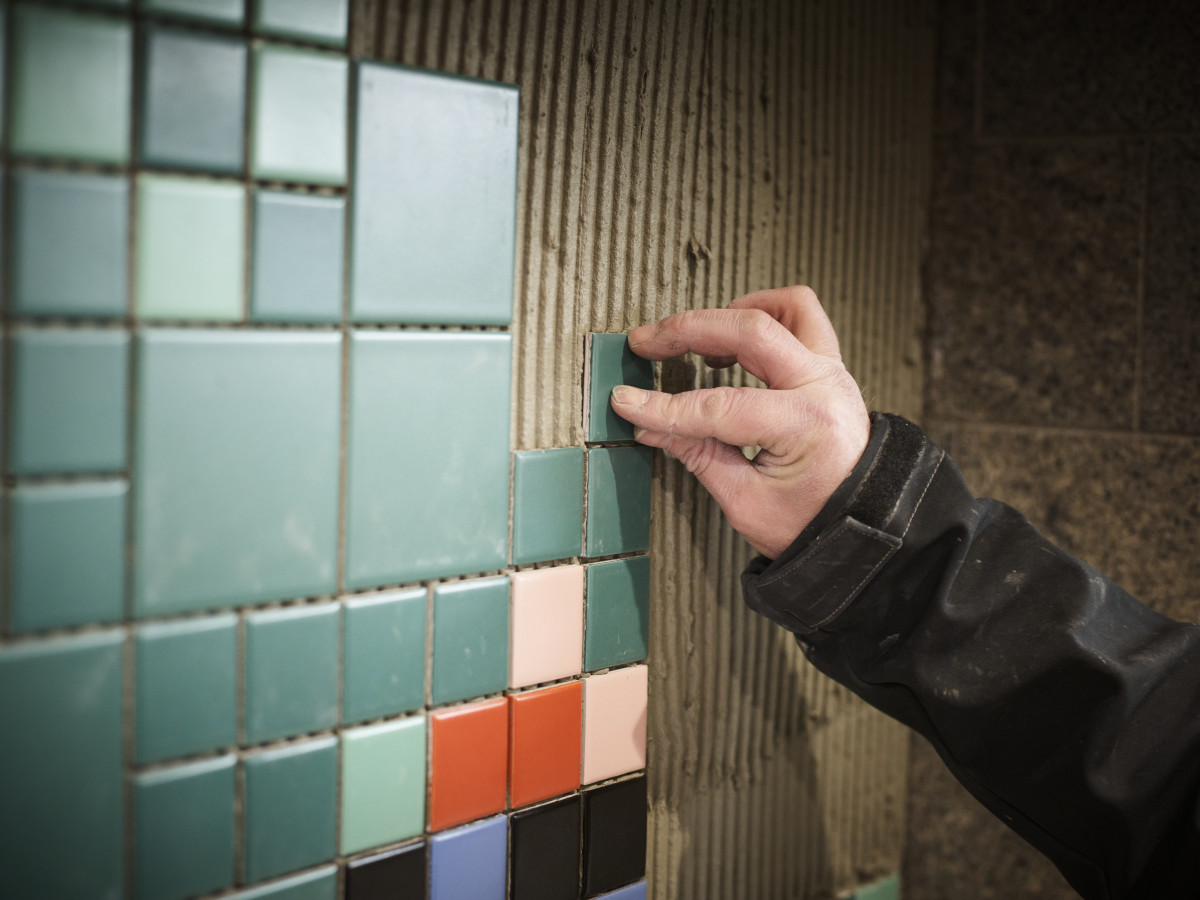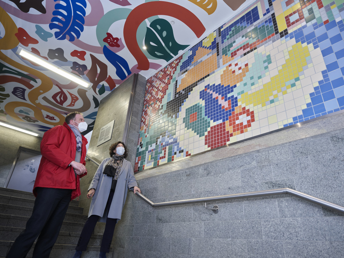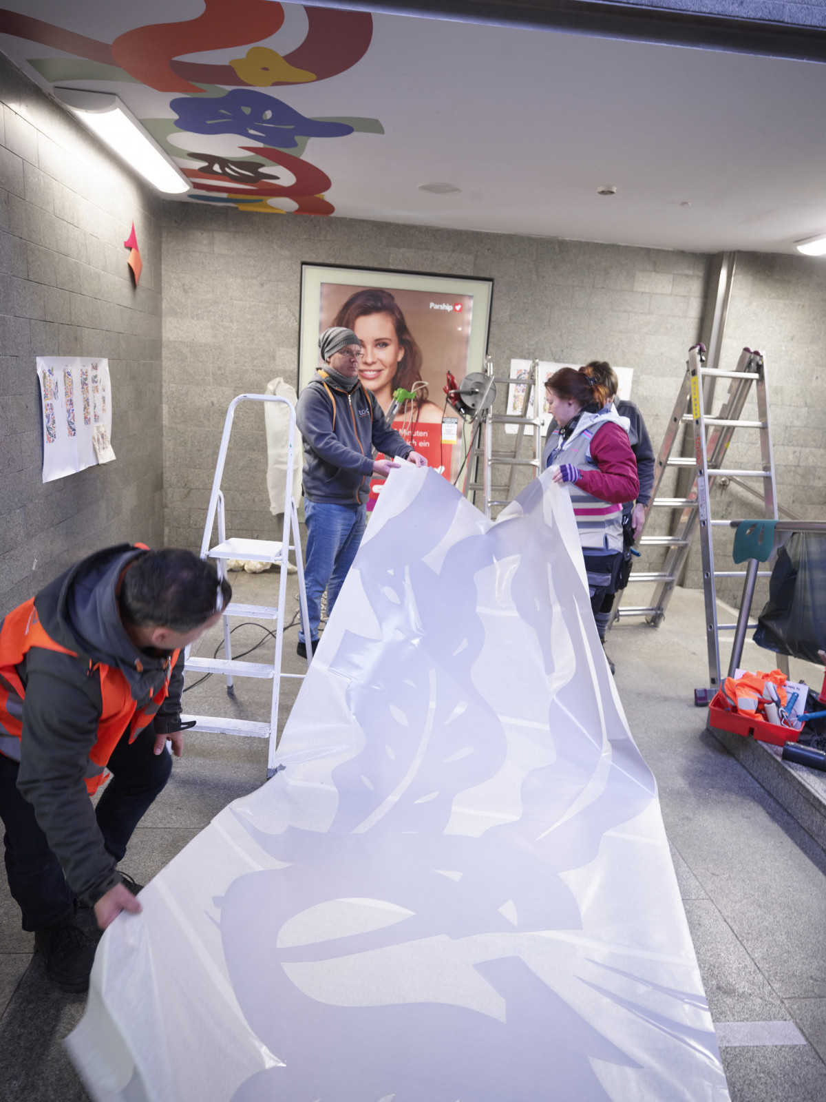 For the second edition of Exit Friedrichstraße, urKultur commissioned the Berlin-based artist Sol Calero. In this site specific art work, Calero uses tiles for the first time to recreate scenes from Los Roques, an archipelago north of Caracas, Venezuela where she grew up. The installation presents two views of the same scene: a window looking out to the mountains and the sun; and a view from the outside of the house looking inwards. Los Rocques bears the legacies of colonialism, and the picturesque houses – such as the one depicted here – present a combination of European, indigenous South American, and Afro-Caribbean influences. Calero uses the hybrid architecture and luscious setting to create a vision of paradise in the middle of Berlin; a tantalising vision created in the midst of the Covid pandemic. The fragmented image, with its vivid and alluring colours and hints of recognisable forms, is destined to remain a puzzle, challenging us to decipher what we see and desire. This edition of Exit Friedrichstraße was realised in cooperation with Villeroy & Boch and Weltkunst magazine.